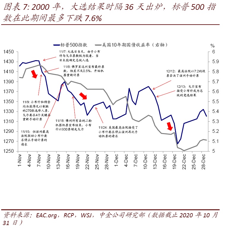 3) 在佛州陷入僵局(目前RCP民调两者相差1.2%),可能会重演2000年小布什和戈尔的纠纷。这也是我们最为担心的尾部风险,2000年时隔36天到12月中上诉到最高法院,结果才最终出炉,使得选举日变成选举月,进而不可避免的扰动市场情绪(《美国大选的五种情形推演》)。