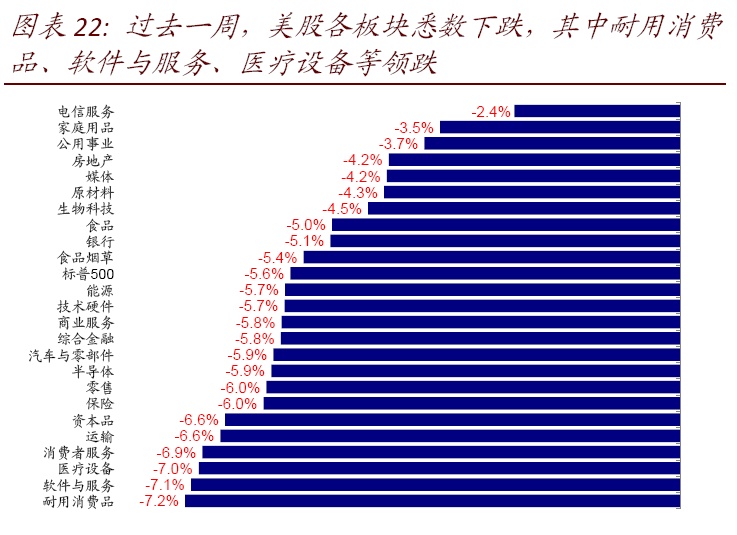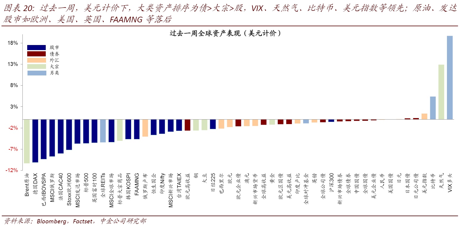 资产表现:债>大宗>股;主要资产尽数下跌,利率美元走高。临近大选叠加欧美疫情继续升级,全球市场呈现出典型的risk off;过去一周,美元计价下,大类资产排序为债>大宗>股,VIX、天然气、比特币、美元指数等领先;原油、发达股市如欧洲、美国、英国、FAAMNG等落后。美股各板块悉数下跌,耐用消费品、软件与服务、医疗设备等领跌;美元指数走强、利率抬升。