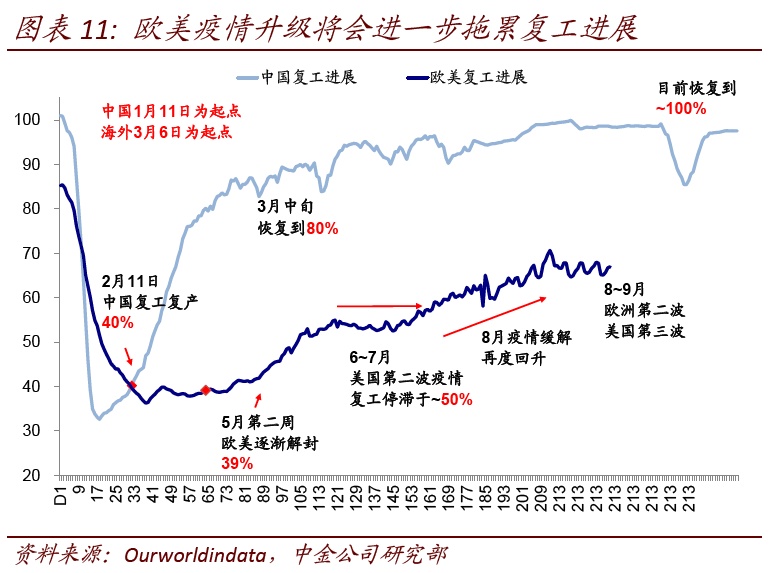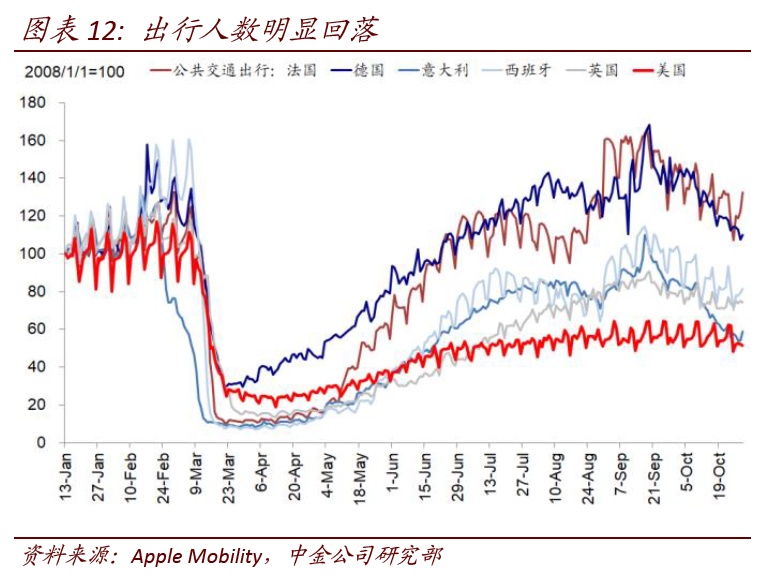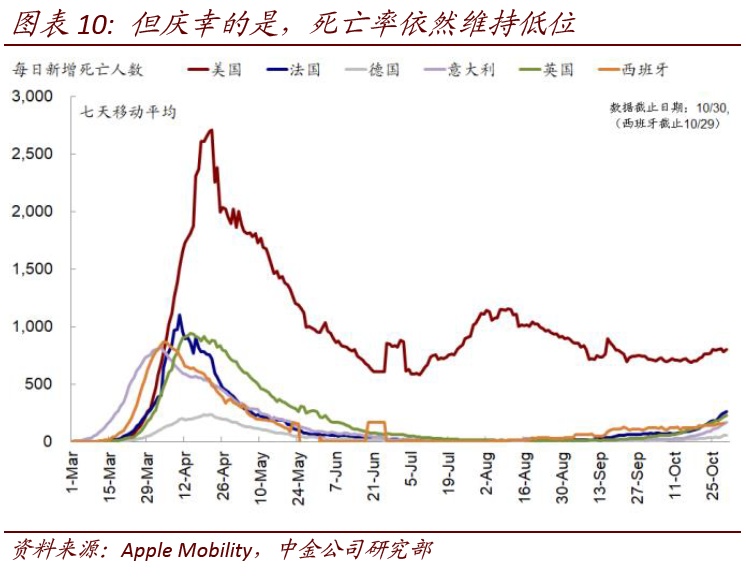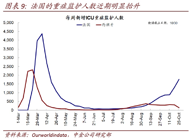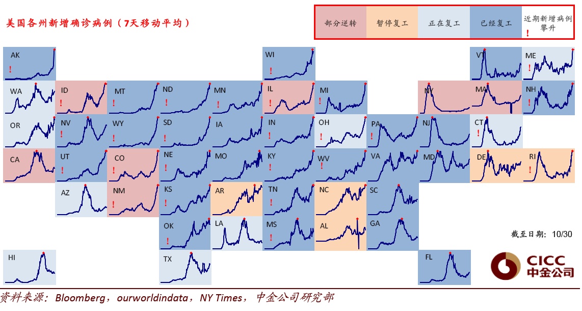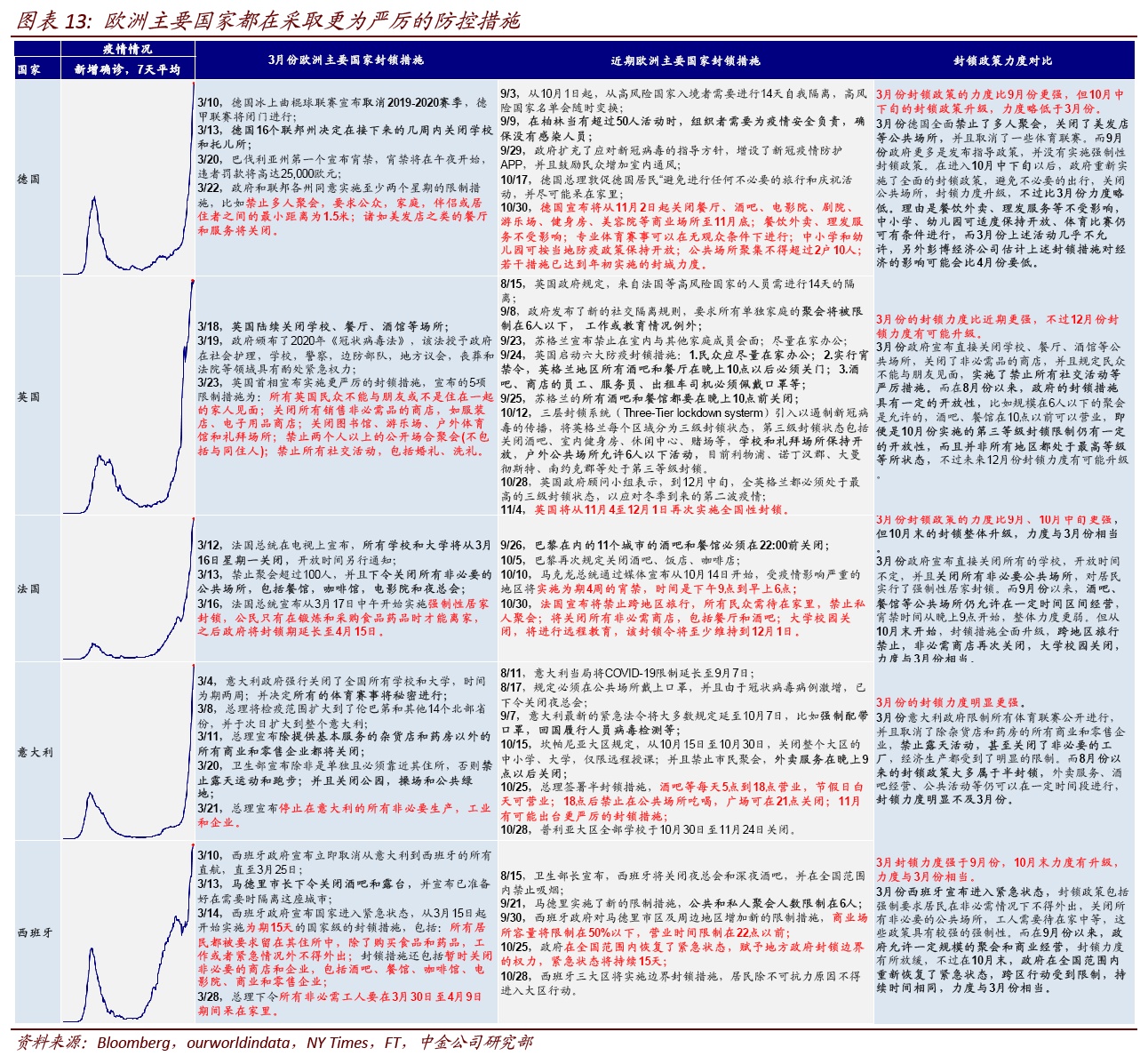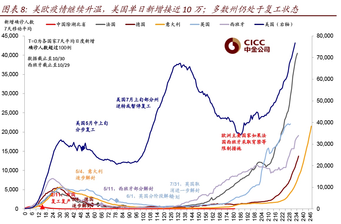 欧美的疫情继续发酵、进而促使欧洲主要国家如法国、德国、及英国等宣布采取新一轮“封城”,这也是拖累上周全球市场表现的主要原因。1)疫情与防控:美国方面,上周单日新增一度逼近10万人,但考虑到此次疫情严重的中西部各州仍处于尚未采取有效的防控措施,因此我们预计这一趋势仍将延续一段时间。相比之下,为了控制疫情的蔓延(法国近期ICU重症看护人数抬升较快),欧洲主要国家(如法德英)宣布11月开始重启“封城”至12月,关闭酒吧、餐饮与公共娱乐场所,根据历史经验,可能在3~4周看到新增确诊拐点。2)复工生产:欧洲明显升级的防控措施,尽管严厉程度上不完全如3月,但也较为接近,因此我们预计将对欧洲的复工进展、生产供应以及四季度的增长带来更大压力(《欧美新一波疫情的潜在影响》)。3)死亡率:不过,值得庆幸的是,目前欧美的死亡率依然明显低于此前,美国还不到8月份高点,因此也不至于像3月份那样完全逆转。