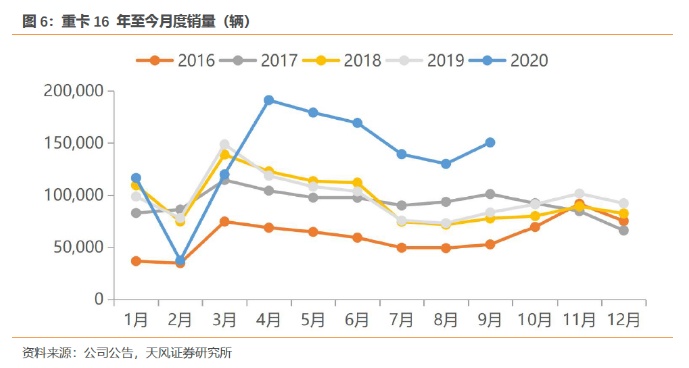 重卡行业持续高景气,里程碑式发动机产品发布。自4月以来,重卡市场连续六个月刷新当月销量历史记录,1-9月累计销量已超过去年全年销量,达123万辆。国三加速淘汰持续作为销量超预期主要驱动力,我们预计仍有百万辆级的国三重卡置换需求有待释放,行业景气有望进一步维持。同时各地支线治超趋严,重卡标载状况持续改善,轻量化重卡需求增加也是