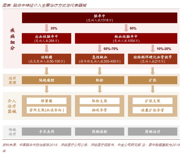 血管狭窄引起的慢性缺血性脑卒中:目前多以药物治疗,介入扩张类器械主要产品为动脉支架。SAMMPRIS研究对比药物与支架治疗颅内动脉狭窄效果,并于2011年公布阴性结果,认为药物治疗优于支架,此后治疗指南一直以药物为优。但此研究在试验设计、技术操作和结果解析等方面均存在瑕疵,后续研究有希望改变扭转结果,拉动扩张类器械发展。