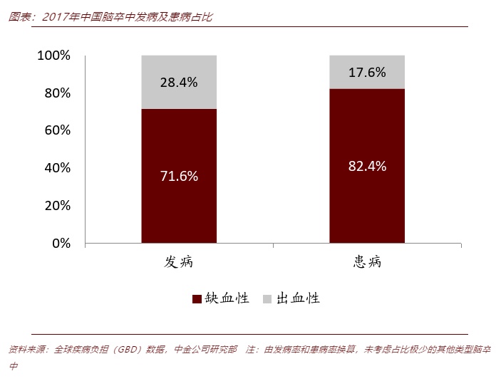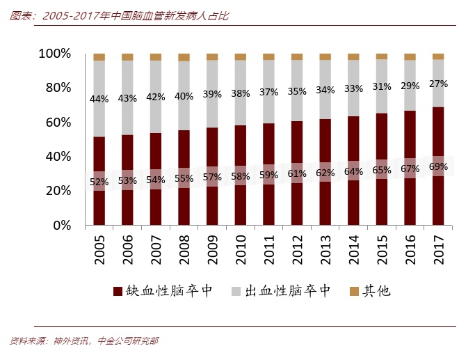 脑卒中患病人群:缺血类(80%)>出血类(20%)。2017年,从新发病人数占比看,脑卒中发病患者缺血性及出血性占比分别为71. 6%和28.4%;从患病存量人数占比来看,我国脑卒中患者缺血性及出血性占比分别为82.4%和17.6%。缺血性脑卒中患病与发病占比均高于出血性,且占比处于上升阶段。2005年至2017年,缺血性脑卒中发病占比由51.6%增加至69.0%(此数据考虑其他未知因素引起的脑卒中)。