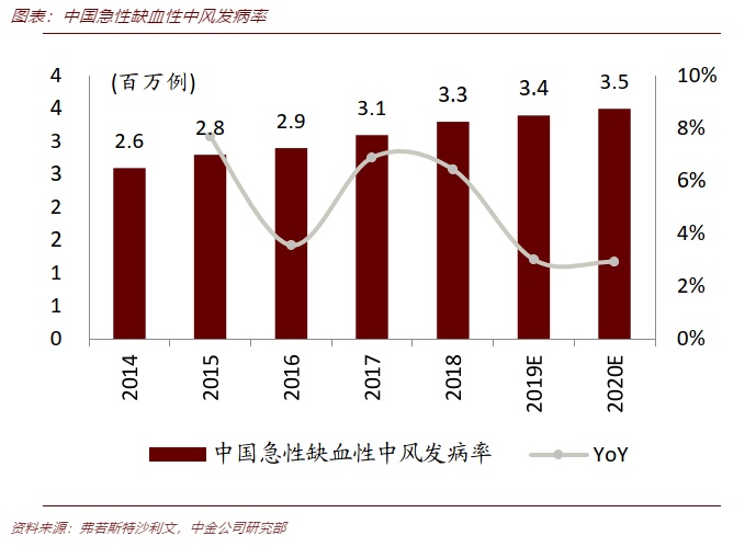 缺血类脑卒中新发病:急性(80-90%)>慢性(10-20%)。根据2018年中国脑卒中防治报告,2017-2018H1中国急性脑卒中发病占比80%-90%,远高于慢性缺血性脑卒中发病占比。根据弗若斯特沙利文数据,中国急性缺血性脑卒中发病数从2014年的260万例提升至2018年的330万例,4年CAGR为6.14%。