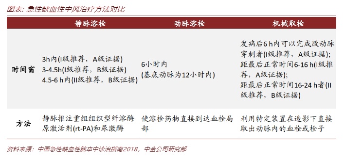 目前指南首选方案药物为静脉溶栓,缺陷明显。目前中国治疗指南首选方法为药物静脉溶栓,但其时间窗短、禁忌证多、再通率低,缺陷明显。根据最新指南,治疗遵循静脉阿替普酶溶栓优先原则,即使患者符合血管内机械取栓治疗,如果该患者也符合静脉溶栓指征,则应该先接受阿替普酶静脉溶栓治疗(Ⅰ级推荐,A级证据),但医生需做好术前准备,不应等待观察阿替普酶静脉治疗的疗效而延误机械取栓(Ⅰ级推荐,B级证据)。