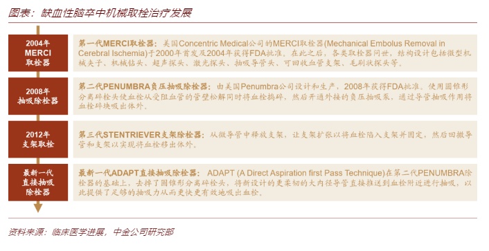 急性缺血性脑卒中:机械取栓治疗主要产品为取栓支架和抽吸导管。急性脑卒中治疗方法为及时清除血管内血栓等,使缺血性脑组织恢复血流,根据原理可分为:1)支架取栓:支架置入血管后将血栓嵌入,结束治疗时一并拉出体外;2)血栓抽吸:利用负压抽吸取出血栓。