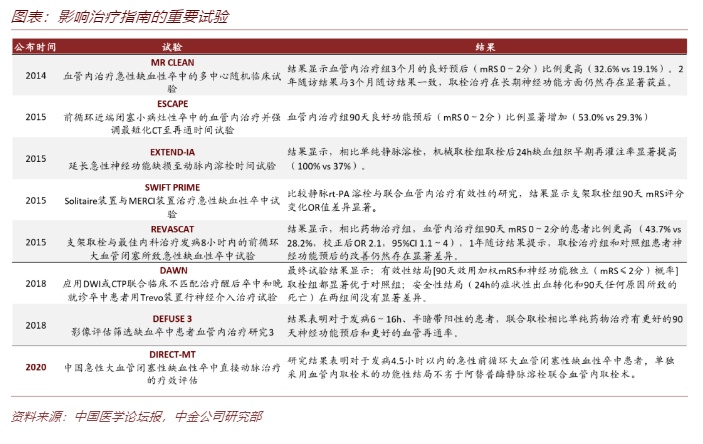 2015年直接支架取栓治疗急性缺血脑卒中迎里程碑。2014年底开始,MR CLEAN等五大研究阳性结果陆续发表,证实血管内机械取栓对疗效的改善。此后2015年,中国、欧洲和美国相继更新指南和专家共识,提高机械取栓治疗急性缺血性脑卒中推荐级别,行业进入快速发展阶段。2020年5月,DIRECT-MT研究结果发布,表明单独采用血管内取栓的功能性结局不劣于阿替普酶静脉溶栓联合血管内取栓术,成为直接机械取栓治疗卒中的新里程碑。