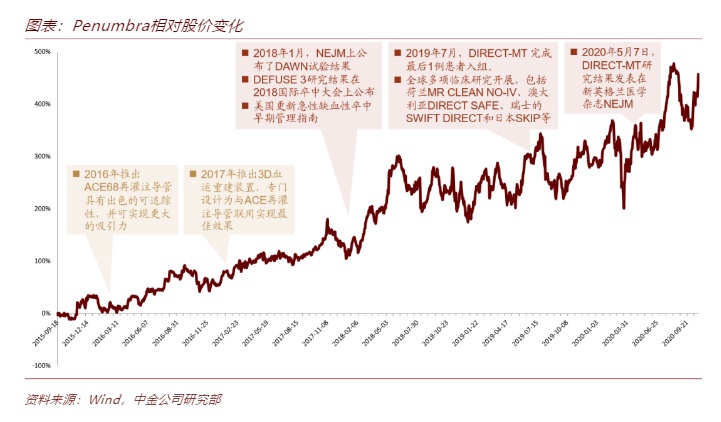支架取栓的突破,带来急性缺血类神经介入器械大发展。美国半影公司Penumbra于2004年成立于美国,于2015年9月18日在纽交所上市。主要从事神经介入等血管介入器械业务,核心产品包括血栓抽吸装备ACE、JET以及弹簧圈系统等。回顾公司市值历史变化后,我们认为治疗指南对机械取栓的倾向性提升以及重大机械取栓研究阳性结果的发布,是股价上升的重要催化剂。