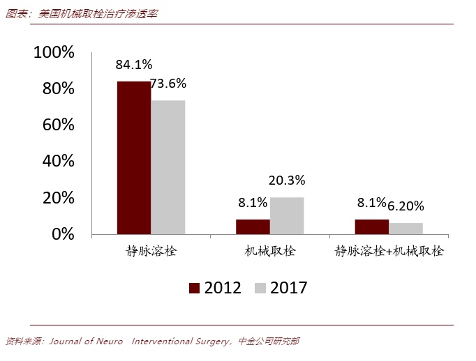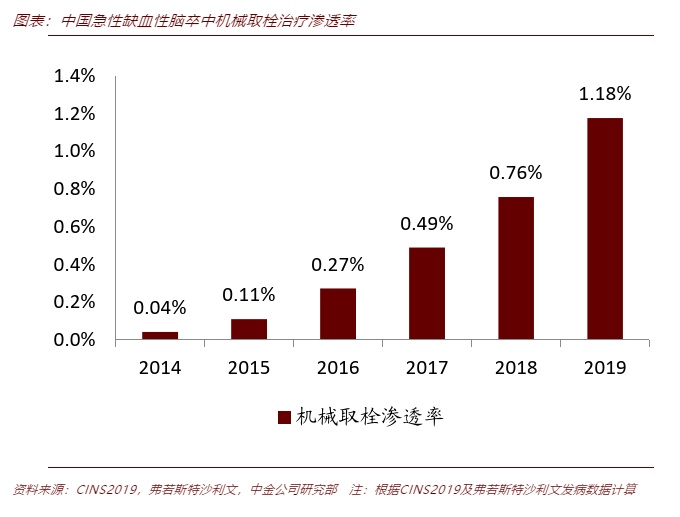 我们预期中国机械取栓治疗渗透率将大幅提升。美国2019年急性缺血性脑卒中早期处理指南已将机械取栓列为血管内治疗优选,2017年机械取栓治疗渗透率已超过20%。2019年中国机械取栓治疗急性缺血性脑卒中渗透率仅约1.18%,我们预期中国市场也将开始广泛应用机械取栓,渗透率有望大幅提升。