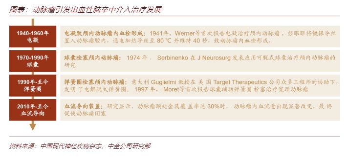 出血类治疗:血管内介入是治疗动脉瘤引起出血性脑卒中主要方法。颅内动脉瘤治疗传统方法为手术夹闭,血管介入方法经历了四个阶段变迁:电凝致颅内动脉瘤内血栓形成、球囊栓塞、弹簧圈栓塞和血流导向装置。目前市场主流使用器械为后两种。
