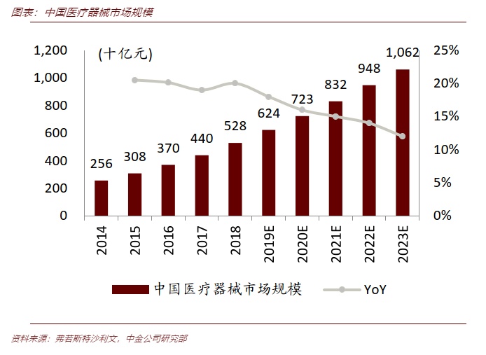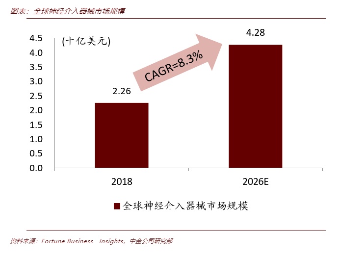 全球神经介入器械市场规模超增速。2014至2018年,全球医疗设备器械市场规模从3,752亿美元增长至4,253亿美元,复合增速为3.2%,弗若斯特沙利文预测2018至2023年增速将达5.4%。2018年,全球神经介入器械市场规模达22.6亿美元,Fortune Business Insights预期2018-2026年将维持8.3%复合增速,超过医疗设备器械平均增速。