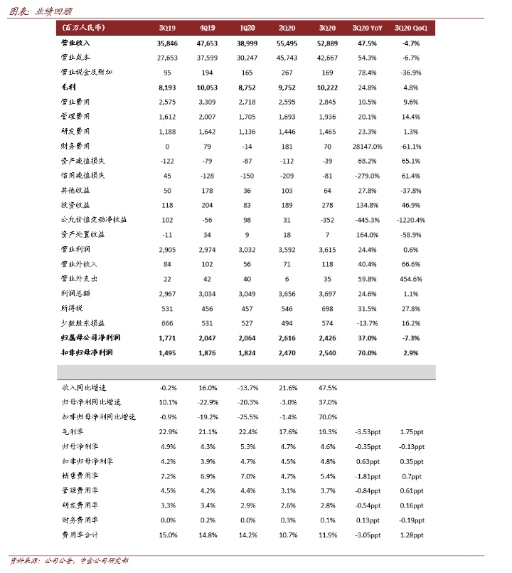 潍柴动力(02338)公布3Q20业绩:3Q20收入528.89亿元,同比+47.5%,环比-4.7%;归母净利润24.26亿元,同比+37.0%,环比-7.3%;扣非净利润25.40亿元,同比+70.0%,环比2.9%。1-3Q20收入1473.84亿元,同比+16.32%;归母净利润71.06亿元,同比+0.67%,对应EPS0.90元;扣非净利润68.33亿元,同比+5.99%。符合预期。