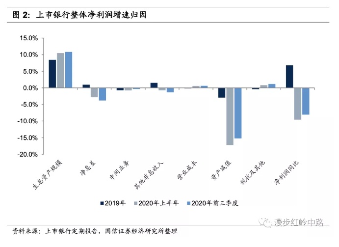 2020年前三季度上市银行整体归母净利润同比下降8.1%,较上半年的增速有所回升。从净利润增长的归因分析看,关键驱动因素与中报比变动不大:
