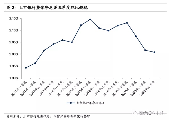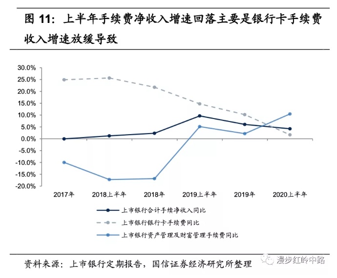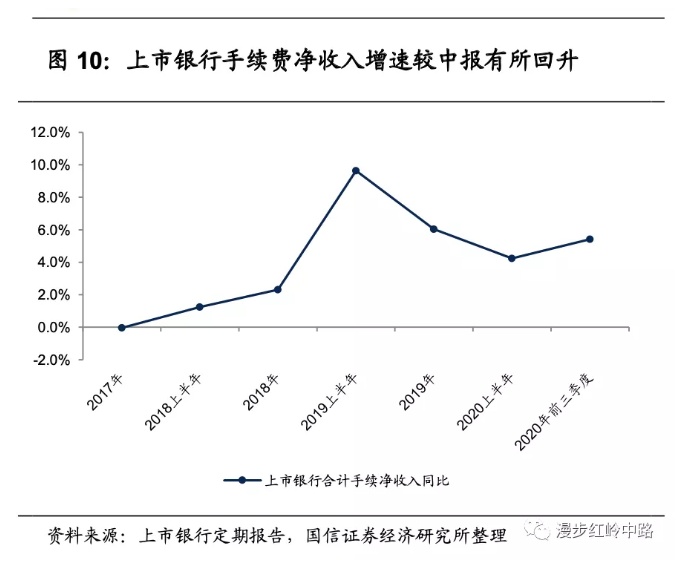 今年前三季度手续费净收入增速较上半年有所回升。手续费收入核心来源是两大类:一是银行卡,二是资产管理及财富管理手续费(包括理财、代销、托管)。今年上半年手续费净收入增速回落主要是因为卫生事件影响导致银行卡手续费收入增速放缓,我们估计三季报手续费净收入增速回升主要是随着卫生事件冲击消退,银行卡手续费收入恢复常态导致。但考虑到这部分收入占比较少,因此其对净利润增速边际上不会有很大影响。