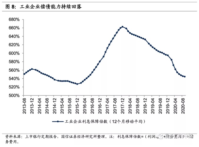 往后看,我们预计今明两年银行不良生成率仍将处于较高水平。主要原因在于,工业企业作为银行不良贷款主要来源之一,其偿债能力持续下降将给贷款质量产生较大压力。