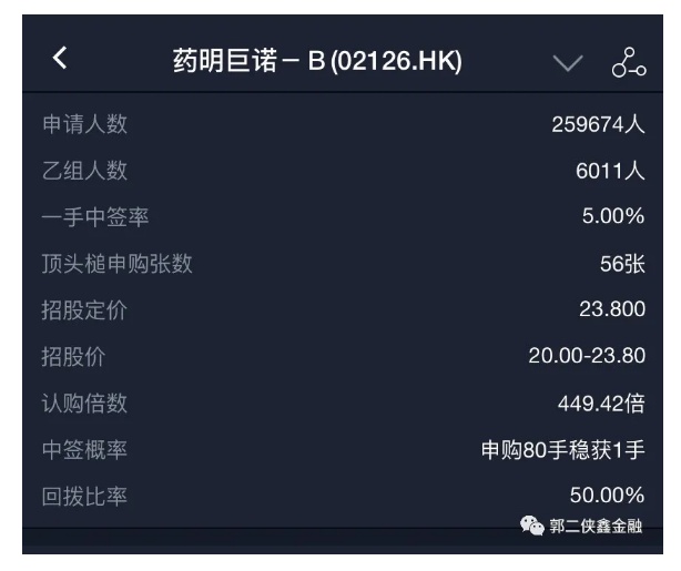 申购人数259674人,最终超额认购449.42倍,回拨50%,顶头槌56张,一手中签率5%,申购80手稳中一手。本次招股价区间为20-23.8港元,最终以上限定价23.8港元,每手11900港元。