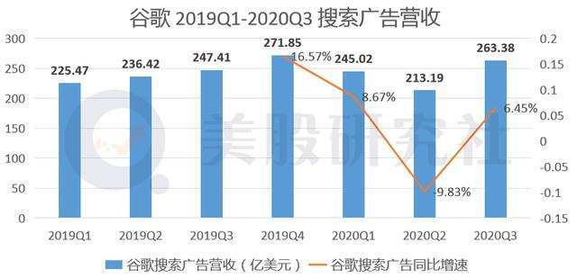 谷歌最新的财报显示:2020财年三季度,搜索业务营收263.38亿美元,同比增幅6.45%,占据季度总营收的比重高达57%。从国内最大搜索引擎百度看,二季度其搜索业务收入为189亿人民币,环比增长24%,占据二季度收入的比重为72%。