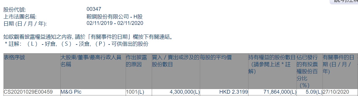 智通财经APP获悉,香港联交所最新资料显示,10月27日,M&G Plc增持鞍钢股份(00347)430万股,每股作价2.3199港元,总金额约为997.56万港元;增持后最新持股数目约为7186.4万股,最新持股比例为5.09%。