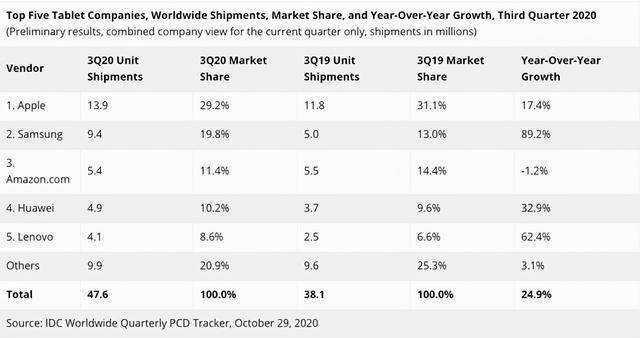 智通财经APP获悉,11月2日消息,市场分析公司IDC发布2020年第3季度全球平板电脑的市场分析报告,Q3平板电脑全球市场出货量达4760万台, 同比增长24.9%。出货量前五的品牌分别是苹果(AAPL.US)、三星、亚马逊(AMZN.US)、华为和联想(00992)。