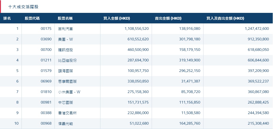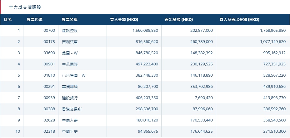 港股通(深)十大活跃成交股