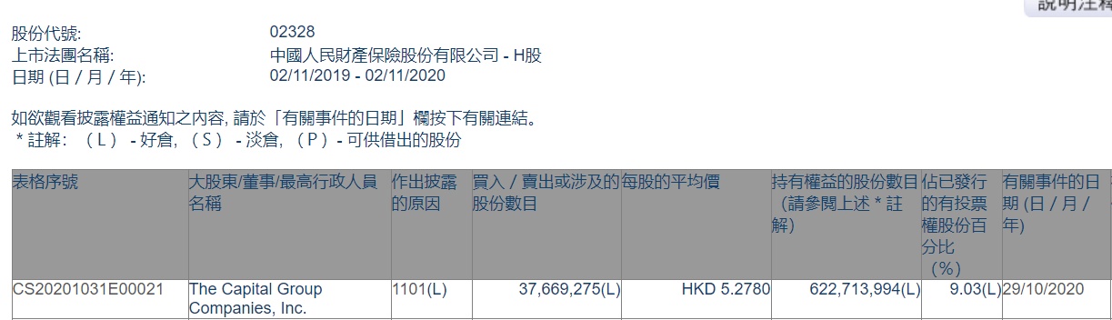 智通财经APP获悉,香港联交所最新资料显示,10月29日, The Capital Group Companies, Inc增持中国财险(02328)约3767万股,每股作价5.278港元,总金额约为1.99亿港元。增持后最新持股数目约为6.23亿股,最新持股比例为9.03%。