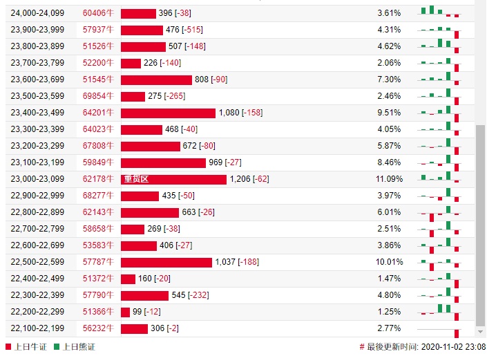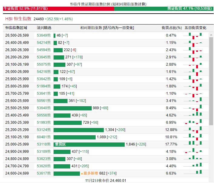 智通财经APP获悉,截至11月2日,恒指最新的牛熊街货比例53:47。法兴银行恒指牛熊证街货分布图中的数据显示,熊证街货重货区在25000-25099区间,该区间最新熊证数量为1846张,较上一交易日增加226张;最多新增在24600-24699区间,该区间最新熊证数量为682张,较上一交易日增加374张。牛证街货重货区在23000-23099区间,该区间最新牛证数量为1206张,较上一交易日减少62张。