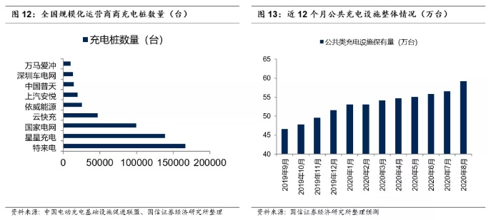 截至2020年8月,我国充电桩保有量138.2万台,公共类桩车比仅为1:2.76,距离规划目标仍有较大差距。根据中国电动充电基础设施促进联盟统计,截至2020年8月我国累计拥有公共类充电桩59.2万台,合计充电桩约138.2万台。根据我国2019年底新能源汽车保有量381万辆计算,充电桩与新能源车的配比仅为1:2.76,远低于《电动汽车充电基础设施发展指南(2015-2020年)》中要求的2020年1:1的水平。而根据《节能与新能源汽车技术路线图(2017)》规划,2020/2025/2030年我国充电桩保有量不少于1.2/3.6/4.8万个,充电桩数量不少于500/2000/8000万个,充电站和充电桩的建设有待加速。根据充电网络配套“先车后桩”的发展策略,伴随着国内新能源汽车的保有量的提升,充电桩建设将迈入快速放量阶段。