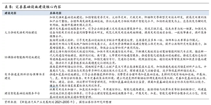 主要包括能源补给设施和智能化设施两位维度。能源维度:加快推动充换电、加氢站建设;智能化维度:加强信息通信与道路交通等基础设施建设,提升互联互通水平和使用效率,同时鼓励商业模式创新。值得注意的是基础设施建设里面持续提到了换电模式和加氢站。此外,除了能源维度,还强调持续推进智能路网设施建设,包括无线通信网络建设、交通标志标识、北斗卫星导航系统在高精度定位领域应用等智能化相关基础设施。