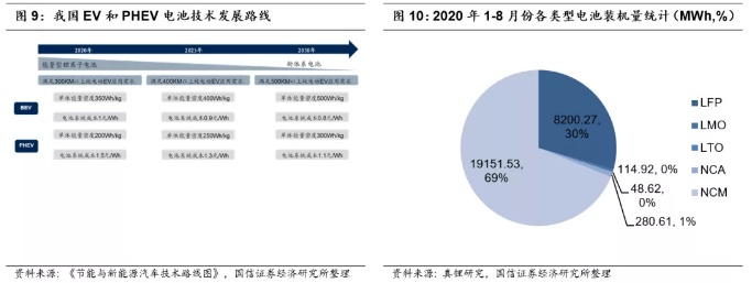 伴随锂离子电池电化学体系不断进步以及制造工艺的完善,目前锂离子电芯能量密度已经能够做到300Wh/kg以上,虽然目前我国动力电池发展从对单一的能量密度指标要求逐步转向循环寿命及安全性、能量密度以及制造成本三因素的综合考量,但能量密度指标仍然是锂电池的核心指标之一,根据《节能与新能源汽车技术路线图》规划2020/2025/2030年BEV动力电池单体比能量需要达到350Wh/kg、400Wh/kg和500Wh/kg。与此同时,伴随CTP、刀片电池等技术迭代,磷酸铁锂电池市场回暖,预计磷酸铁锂电池凭借安全性、循环寿命、价格等优势仍将占据着部分中低端的市场份额,根据真锂研究统计2020年1-8月磷酸铁锂电池装机量实现8.2GWh,占比达到29.50%。