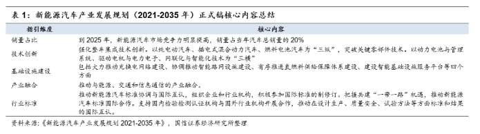 《新能源汽车产业发展规划2021-2035年(征求意见稿)》(后文简称《规划》)是继《节能与新能源汽车产业发展规划(2012-2020年)》文件后的又一具备重要意义的产业指引政策。该政策指出国家发展新能源的基本原则遵循“市场主导、创新驱动、协调推进、开放发展”,整体而言,该政策在销量占比、技术创新、基础设施建设、产业融合、行业标准等多个层面给予新能源行业产业引导。
