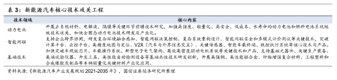 从《规划》中列出的新能源汽车核心技术攻关工程来看,主要聚焦在动力电池、智能网联、基础技术三个维度。动力电池维度主要聚焦在正负极、电解液、隔膜等材料环节的技术突破,同时前瞻布局突破燃料电池和固态电池。智能网联也同样被划入了新能源汽车核心技术攻关工程,电动化与智能化在技术层面具有较为紧密的技术联系,后期高精度地图、V2X、智能车载终端将是突破重点。基础技术层面则侧重于车规级芯片、新型电子电气机构、高效高密度驱动电机系统以及车载操作系统等环节技术突破。