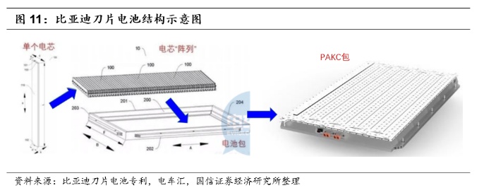 2020年3月,比亚迪发布并量产新一代电池产品“刀片电池”。比亚迪的刀片电池是一种长电芯方案,在比亚迪原有的电芯尺寸基础上通过对电芯长度增长、厚度减薄的扁长化设计,最终长度通常大于0.6m,最长可达到2500mm(10倍于传统平台磷酸铁锂电池电芯)。再通过阵列的方式排布在一起,就像“刀片”一样插入到电池包里面。由于空间改善和零部件数量减少,比亚迪刀片电池的优势主要体现在以下几个方面: