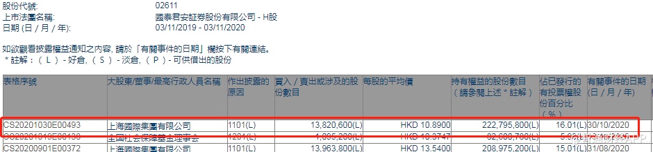 智通财经APP获悉,香港联交所最新资料显示,10月30日,上海国际集团有限公司增持国泰君安(02611)1382.06万股,每股作价10.89港元,总金额约为1.51亿港元。增持后最新持股数目约为2.23亿股,最新持股比例为16.01%。