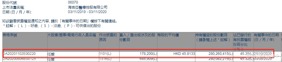 智通财经APP获悉,香港联交所最新资料显示,10月28日,执行董事任爱增持海吉亚医疗(06078)17.82万股,每股作价45.8133港元,总金额约为816.39万港元。增持后最新持股数目约为2.80亿股,最新持股比例为45.35%。