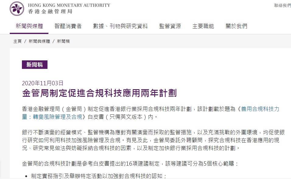 智通财经APP获悉,11月3日,香港金管局制定促进香港银行业采用合规科技两年计划,该计划载于题为《善用合规科技力量:转变风险管理及合规》。