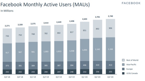 首先,Facebook的用户增速一直保持在两位数,没有任何放缓的迹象。在最近一个季度,其平台上27.4亿的MAU,意味着12%的稳定增长率,与历史相似。