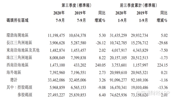 码头业务方面,前三季度,公司旗下中远海运港口总吞吐量9109.63万标准箱,同比下降1.2%;第三季度总吞吐量3346.21万标准箱,同比上升3.3%。其中,第三季度,渤海海湾地区出货量最大,达到1119.8万标准箱,同比增长5.30%;出货量增长最大的是西南沿海地区,虽然出货量仅147.3万标准箱,但同比增长240.05%;长三角地区是唯一出货量呈现出负增长的地区,出货量390.7万标准箱,同比降低26.12%。