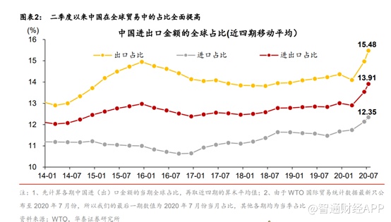 6月至今,伴随国内公共卫生事件的控制以及复工复产,我国进出口金额改善明显,两年来首次连续4个月正增长,且有加速增长态势。在WTO口径下,以美元计价,2019年1-7月中国出口占全球总量的比例为13.8%;2019全年为14.4%;2020年1-7月这一比例小幅上至15%。分季度看,今年二季度以来,我国出口贸易份额上行较为明显。以近四个季度移动算术平均值衡量,在一季度中国疫情较为严重的时期,中国出口占全球比例下滑至14.1%,而二季度则升至15%,略微超过2015年四季度的峰值;今年7月份(当月)该比例进一步上升至15.5%。我国进口份额同样呈现二季度以来逐渐提升的趋势。在我国进口、出口占全球比例双双提升的背景下,以近四个季度移动平均值衡量,今年二季度我国进出口贸易总额占全球比例达13.5%;7月份进一步上升至13.9%。