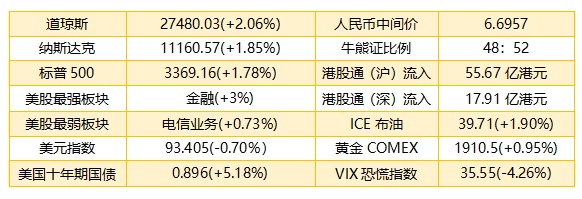 1、 周二,美国总统大选正式开始,民主党候选人拜登似乎有领先优势,为市场燃起更多希望,期盼选后获得更大规模纾困方案和基建支出,美股飙超700点。截至收盘,道琼斯指数涨554.98点,涨幅2.06%,报27480.03点;标普500指数涨57.28点,涨幅1.73%,报3367.52点;纳斯达克综合指数涨202.96点,涨幅1.85%,报11160.57点。港股ADR指数则小幅下跌,按比例计算,收报24798点,跌141.35点或0.57%。