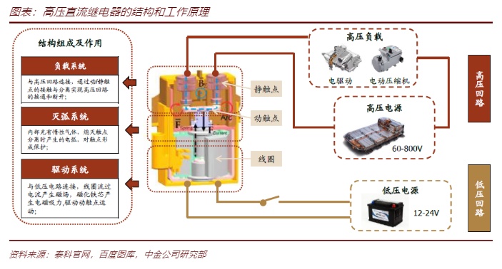 功能上,高压直流继电器可实现新能源车安全需求。高压直流继电器是一种自动控制的开关元件,在整车控制器输入信号下,驱动系统接通产生电磁力,使动/静触点接通或分离、负载电路接通或断开,整个过程与使用者保持物理隔离。利用高压直流继电器非接触的开关特性,可实现紧急状态下切断高压电路、在上/下电过程对负载电路实施通断控制,使新能源车满足国标安全法规的要求。
