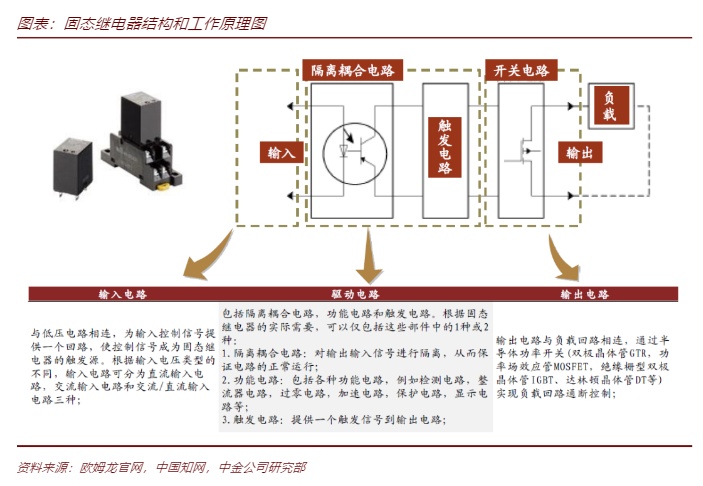 固态继电器的替代优势:无触点、无电弧切断电路,安全可靠,寿命长。传统电磁继电器(包括高压直流继电器)通过动/静触点接触或分离,实现电路接通或断开,过程中不可避免产生电弧、影响继电器可靠性、寿命,是传统继电器应用的痛点。固态继电器没有触点,利用半导体元件(双极晶体管GTR,功率场效应管MOSFET,绝缘栅型双极晶体管IGBT、达林顿晶体管DT等)的开关特性,实现无接触、无电弧的接通或断开电路,相比传统电磁继电器,在可靠性、寿命上优势明显,如传统电磁继电器切断寿命普遍在10W-30W,而固态继电器切断寿命可到100W以上;同时,固态继电器还具备切换速度快、对外界电磁干扰小、耐振动、耐冲击等特点。