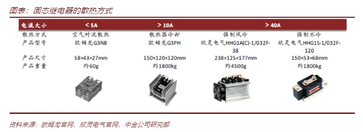 在散热上,固态继电器因功率损耗大、大电流下需加装散热装置,难平衡体积、重量和经济性。固态继电器因半导体元件导通压降较大(IGBT 1-4V、MOSFET 1-3V、大功率GTO 1-2V),存在功率损耗,损耗值由压降和负载电流乘积决定、以热量形式消耗。在大电流场合应用,固态继电器温升明显,需要进行散热以避免器件损坏:通常负载电流小于5 A时利用空气对流散热;负载电流大于10 A加装散热器;负载电流大于40 A时,根据设计体积大小、采用风冷或水冷散热。新能源车电流达200-300A,固态继电器必须配置散热装置,引起设备体积、重量和成本增加,难平衡小型化、轻量化和经济性。