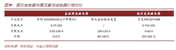 大功率直流固态继电器对散热、控制电路板性能的高要求传导至价格,使同等载流水平下、固态继电器价格是高压直流继电器数倍。