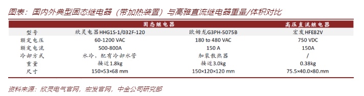 在重量/体积上,固态继电器不具备小型化、轻量化优势。固态继电器在新能源车应用需加装散热装置,且内置控制电路板因绝缘和散热要求提升、尺寸增加,导致固态继电器重量、体积大,不满足新能源车对零部件轻量化、小型化的需求。