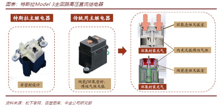 当前全市场新能源车均配置高压直流继电器作为高压电路控制和安全保护的技术方案;由于高压安全策略需经过一系列模拟/试验/现实应用的论证,周期长、成本高,技术方案一经确定在车型/平台存续期内难改变,对高压直流继电器形成需求刚性。从产品结构看,新能源车主回路/快充回路继电器以陶瓷密封型产品为主流配置,主要是环氧密封产品在高低温冲击、大电流分断、耐短路电流方面存在一定问题,在主回路/快充回路大电流场合应用安全/可靠性存在风险。