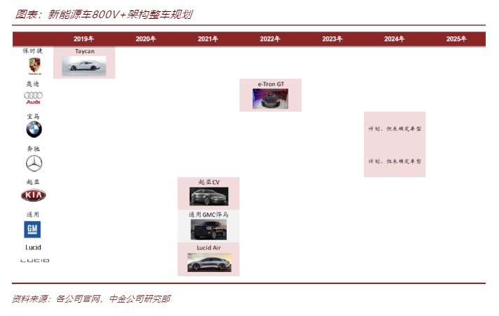 驱动因素2:与特斯拉形成差异化竞争优势。在快充技术上,特斯拉通过增大充电电流方式将快充功率提升至250KW、SOC 3%至90%需要近40分钟;保时捷、宝马、奥迪、奔驰等汽车制造商选择800V+高压化方案提升快充功率,可实现350KW快充、将充电速度提高至20分钟以内;同时,800V+方案可保证整车高功率输出、降低系统电流,带来热损耗、线缆直径、线缆重量的降低,构建出与特斯拉的差异化竞争优势。