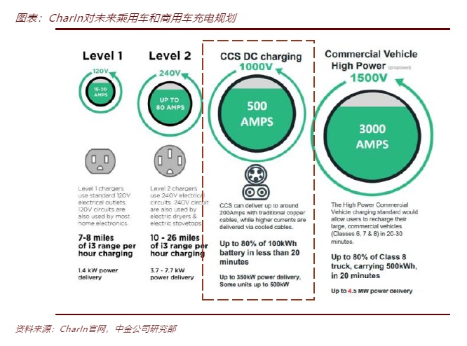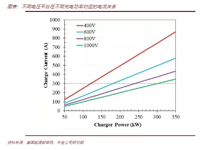 驱动因素1:350KW快充技术需求。国内外目前直流快充功率主要为50-150KW,以主流电动车带电量60-70KWh计算,对应充电时间30min-80min,与传统燃油车加油时间仍存在较大差距,需要往更高功率充电技术发展;国际充电组织CharIN将快充功率目标定义为350KW,可将充电效率提升至20分钟以内、接近与燃油车加油的水平。在现有300-400V架构上开发350KW快充技术,存在充电电流过大、充电设备无法承载等问题;特斯拉通过液冷技术、将充电电流提升至610A,目前只实现250KW充电功率、进一步提升功率难实现技术和成本的平衡;而通过高压化方式、将电动车平台电压提升至800V+,可避免较大的充电电流,可支撑快充功率提升至350KW。