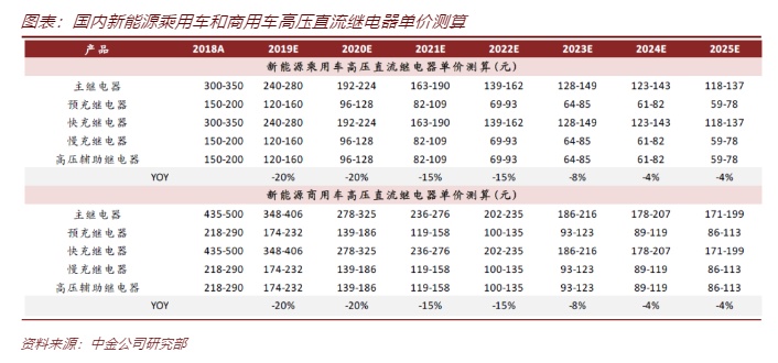 高压直流继电器单价:新能源车不同场景对高压直流继电器性能需求不同、导致单价差异: 1)新能源车主回路/快充回路高功率/大电流、对高压直流继电器载流能力/分断能力等性能要求高,常配置大电流规格密封型继电器,单价高;预充/慢充/高压负载回路(空调电动压缩机、PTC加热器等)功率/电流较低、配置小电流/敞开型继电器,单价低;2)针对不同类别新能源车,商用车继电器单价比乘用车高40%-50%,主要是商用车功率、电压电流更高,需要配置耐压、载流能力、分断能力等性能更强的继电器。以2018年国内高压直流继电器单价为基础数据测算单价,我们认为短期内市场竞争加剧叠加客户端降本诉求提升、将导致价格下滑;随着中长期市场格局趋于稳固、集中度进一步提升,我们预计价格将逐步企稳、 2019-2025年单价降幅-20%/-20%/-15%/-15%/-8%/-4%/-4%。