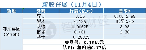 智通财经APP获悉,亚东集团(01795)正在招股中,截至11月4日,辉立 、耀才、艾德、信诚为亚东集团借出0.28325亿港元,超额认购逾0.77倍。