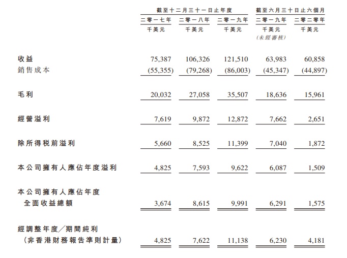 公司在2017财年至2020年前六个月,经调整后公司纯利分别为482.5万美元、762.2万元、1113.8万美元以及418.1万美元。