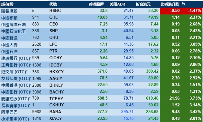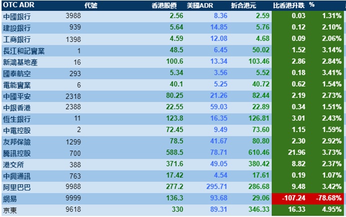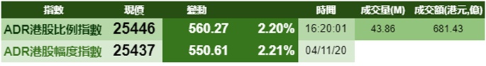 智通财经APP获悉,隔夜美股三大指数齐涨,港股ADR指数跟随上涨,按比例计算,收报25446点,涨560.27点或2.20%。